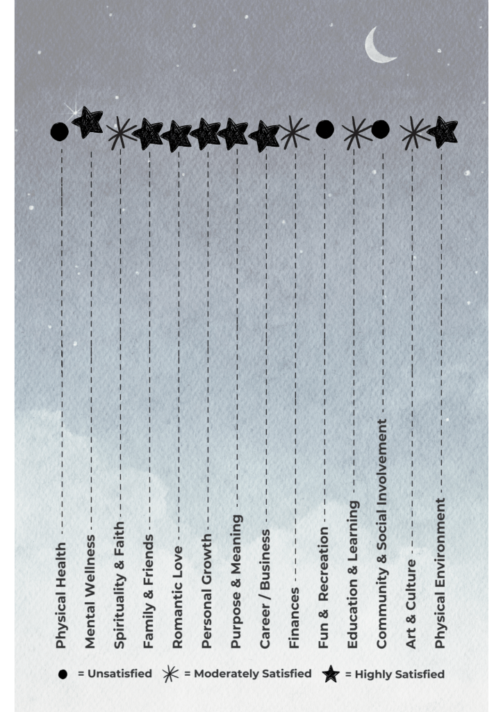 The Starry Skies Life Assessment Tool, which was created for GRATEFUL, gives you a baseline of your overall satisfaction across the key life areas at the start of the journal. It is completed again at the end, so your growth and increased satisfaction at the conclusion of your gratitude journey are beautifully visualized.